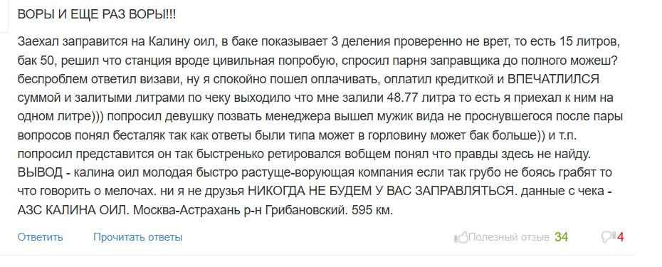«Заехал заправиться. Долил 10 литров и поехал довольный.... Однако радость моя была недолгой: 10 литров своровали (в бак не залили)!!! Заправка в Новоусманском районе у с. Орлово! Хотел написать руководству,но сайты такие, что не свяжешься! НЕ ВЕРЬТЕ СОТРУДНИКАМ Калины Ойл. Они в самом деле ВОРЫ!!»