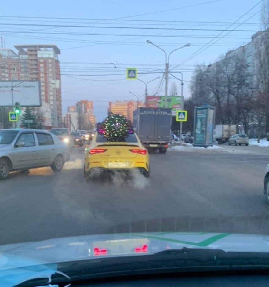 Автомобилисты на дороге в Воронеже могли наблюдать праздничный Mercedes канареечного цвета. Мало того, что иномарка сама по себе выделялась ярким пятном на фоне серой погоды, так еще владелец украсил ее.