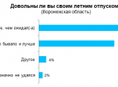 Довольны своим летним отпуском оказались чуть больше половины опрошенных. 41% отдохнувших отметили, что «бывало и лучше». Полное разочарование испытали 2% воронежцев.
