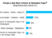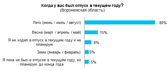 Опрос показал, что 80% работающих воронежцев предпочитают брать отпуск в летнее время. Зимой предпочли отпуск лишь 5% опрошенных. 8% вообще не были отпуске в этом году и даже не планируют его. Порядка 5% трудящихся все же надеются успеть отдохнуть до Нового года.