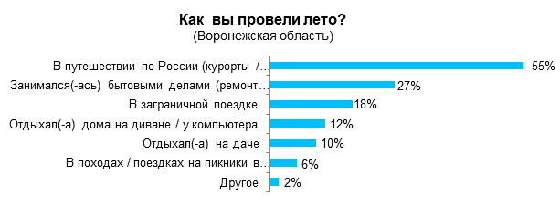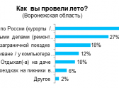 Проводить свой отпуск в путешествиях по России предпочитают 55% воронежцев. Любопытно, что только 18% респондентов во время своего летнего отпуска побывали заграницей. Значительная часть работников - 27% - проводят свои каникулы в домашних хлопотах. Местный туризм оказался наименее популярным видом отдыха – всего 6% голосов опрошенных.