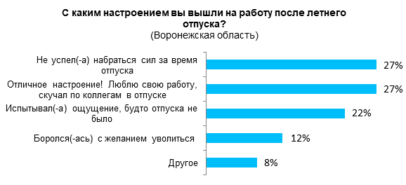 Скучали по любимой работе и коллегам 27% опрошенных, столько же заявили, что так и не успели хорошенько отдохнуть. «Будто отпуска и не было» - такой вариант ответа выбрали 22% опрошенных воронежцев. А вот желание совсем бросить работу испытали 12% вышедших из отпуска респондентов.