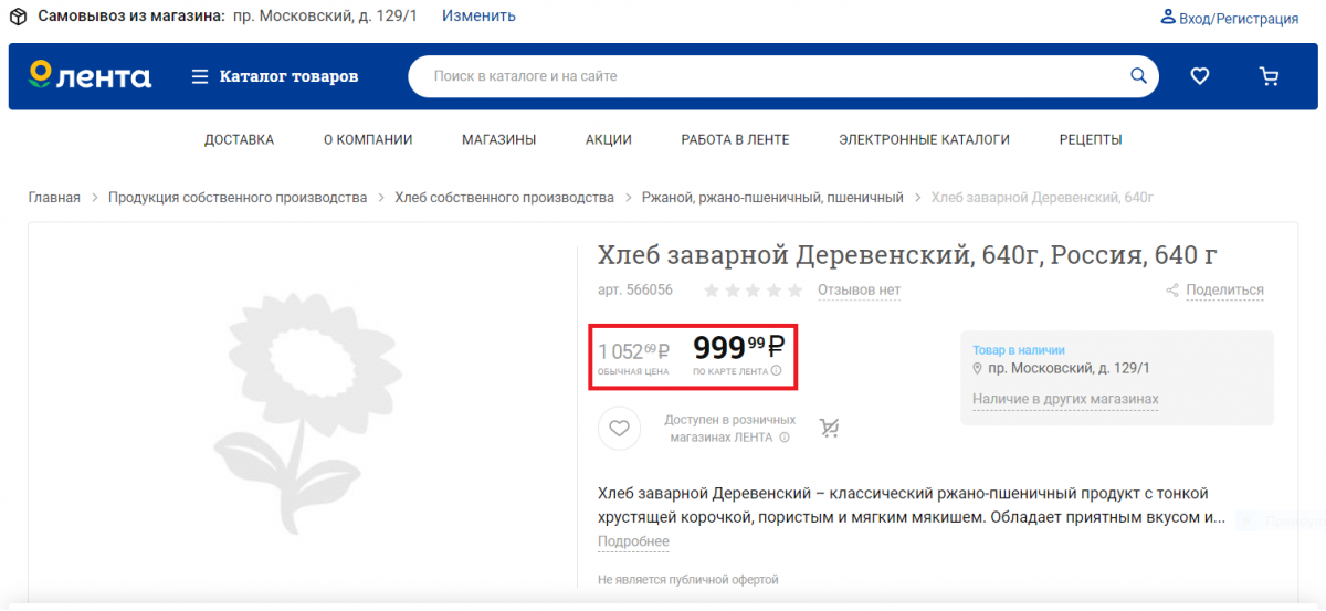 Хлеб заварной «Деревенский», весом 640 грамм стоил 1 052 рубля, со скидкой – 999 рублей и 99 копеек. Товар был изготовлен прямо в супермаркете специально для «Ленты».