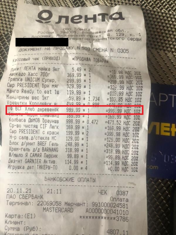 Хлеб за 1000 рублей продали покупательнице в воронежском супермаркете