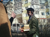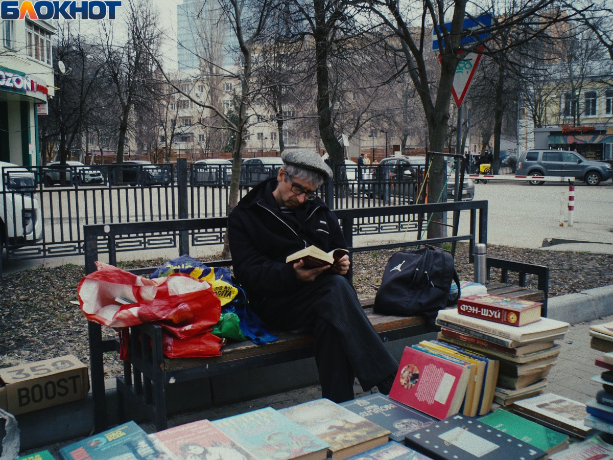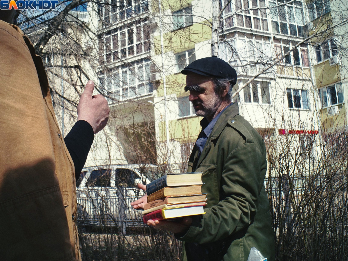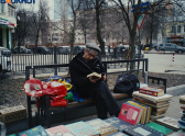 Особую атмосферу кадрам придали продавцы книг. Они расположились на скамейке возле импровизированных столов, уставленных томами.