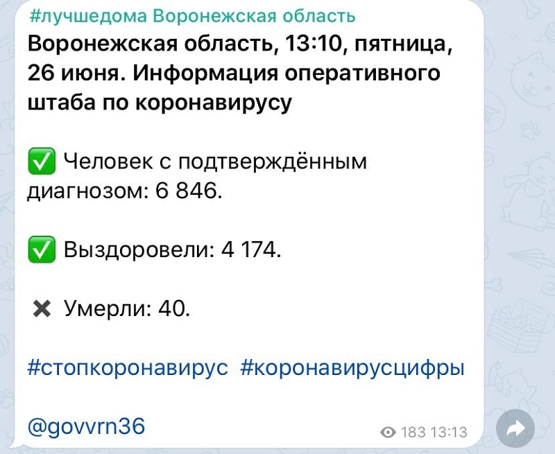 26 июня стало известно, что на территории Воронежской области еще один человек скончался с коронавирусной инфекцией. Соответственно, общее число жертв с новой болезнью достигло 40. Об этом сообщает пресс-служба регионального правительства.