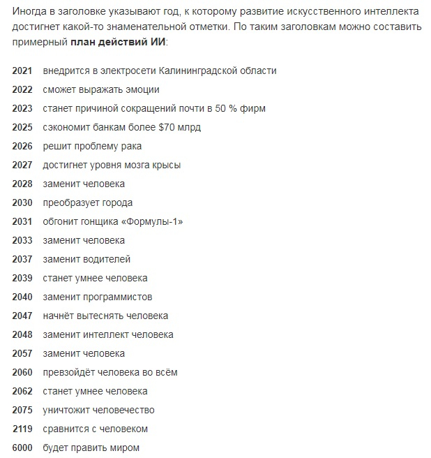 Специалисты «Яндекса» даже составили своеобразный план действий для искусственного интеллекта, изучив заголовки СМИ. Так, к 2119 он сравнится с человеком, а в 6000-м и вовсе будет править миром.
