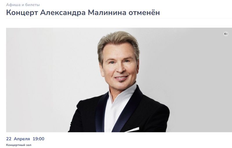 В Воронежском концертном зале (ВКЗ) отменили запланированный концерт известного эстрадного певца Александра Малинина (12+). Он должен был выступить в столице Черноземья 22 апреля. Однако, по непонятным причинам, концерта не будет. «Возврат билетов производится в местах их приобретения», - прокомментировали организаторы отмену концерта Малинина на сайте ВКЗ.
