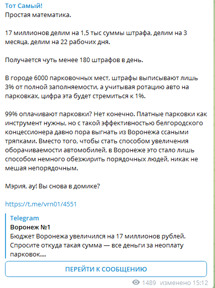 «В городе 6000 парковочных мест, штрафы выписывают лишь 3% от полной заполняемости, а учитывая ротацию авто на парковках, цифра эта будет стремиться к 1%. 99% оплачивают парковки? Нет, конечно. Платные парковки как инструмент нужны, но с такой эффективностью белгородского концессионера давно пора выгнать из Воронежа ссаными тряпками. Вместо того, чтобы стать способом увеличения оборачиваемости автомобилей, в Воронеже это стало лишь способом немного обезжирить порядочных людей, никак не мешая непорядочным. Мэрия, ау».