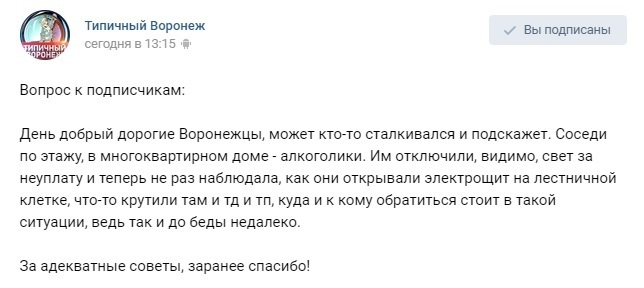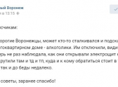 – Им отключили, видимо, свет за неуплату и теперь не раз наблюдала, как они открывали электрощит на лестничной клетке, что-то крутили там, – пишет жительница Воронежа. – Куда и к кому обратиться стоит в такой ситуации, ведь так и до беды недалеко.
