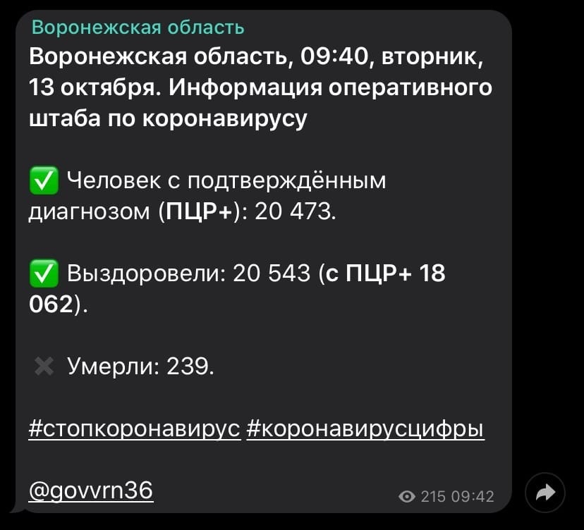 Коронавирус в Воронеже 13 октября: +211 зараженных, 8 смертей и требование закрыть школу на карантин