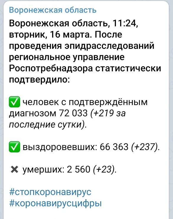 А вот ежесуточное количество погибших уменьшаться пока не собирается. Роспотребнадзор заявил, что 15 марта список жертв ковида пополнили ещё 23 местных жителя. Таким образом, коварная болезнь унесла жизни 2560 человек.