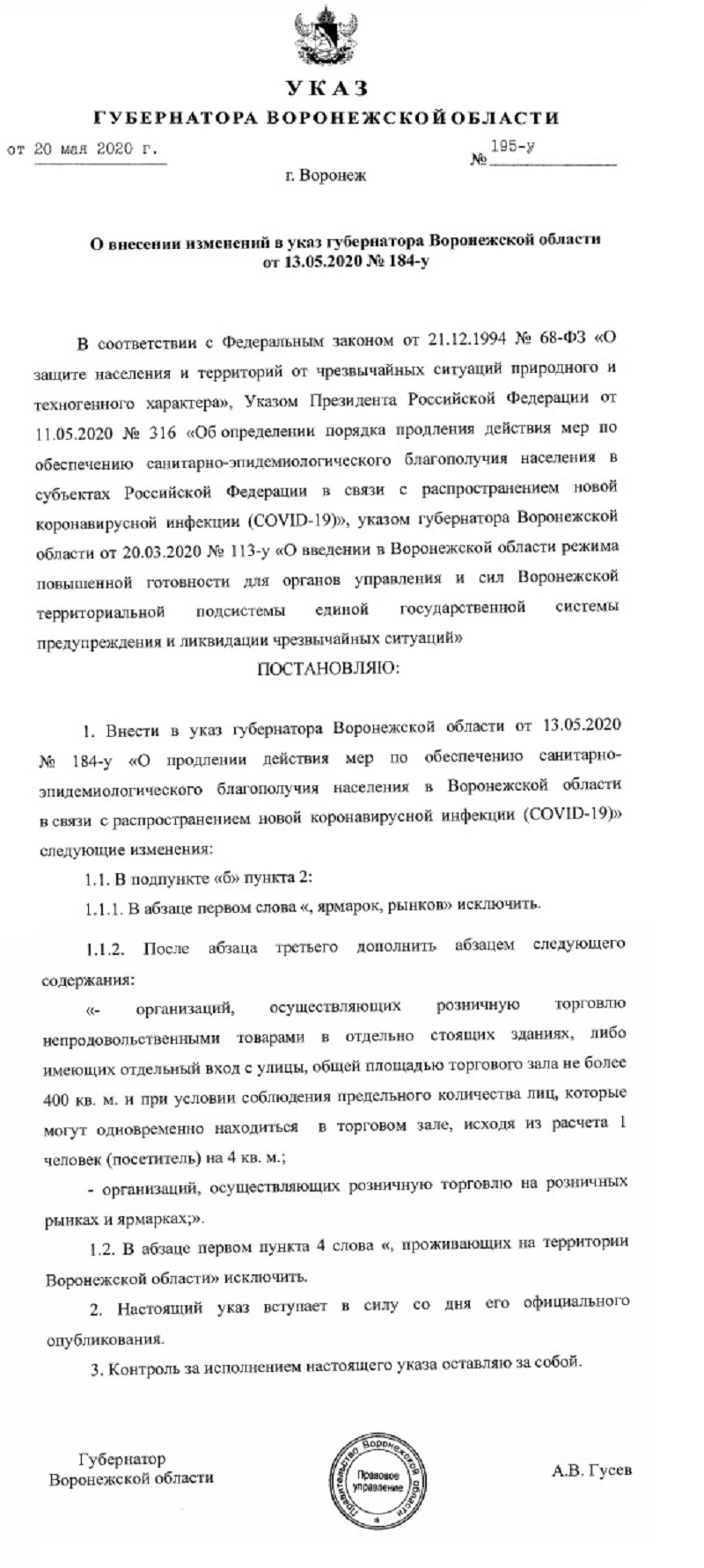 20 мая губернатор Воронежской области Александр Гусев подписал указ, которым официально запустил в регионе первый этап снятия ограничений, введенных из-за пандемии коронавируса. Уже с сегодняшнего дня разрешение на работу получили предприятия, которые до этого были закрыты из-за соображений безопасности. Так, двери распахнут ярмарки и рынки, организации, ведущие розничную торговлю на их территории. Зеленый свет также дали розничным магазинам с непродовольственными товарами. Речь идет о торговых точках в отдельно стоящих зданиях или с отдельным входом с улицы. Их площадь не должна превышать 400 квадратных метров.