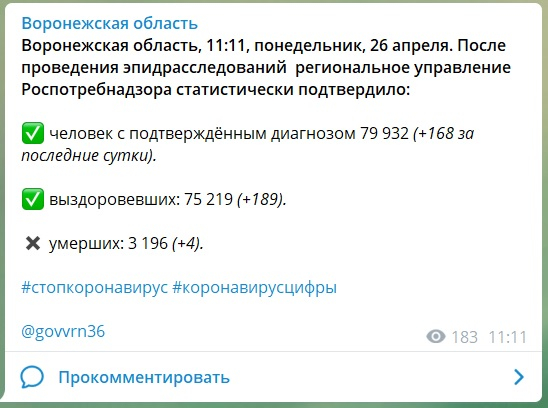 Коронавирус в Воронеже 26 апреля: +168 больных, объяснения депздрава и бойкие комментарии Гусева