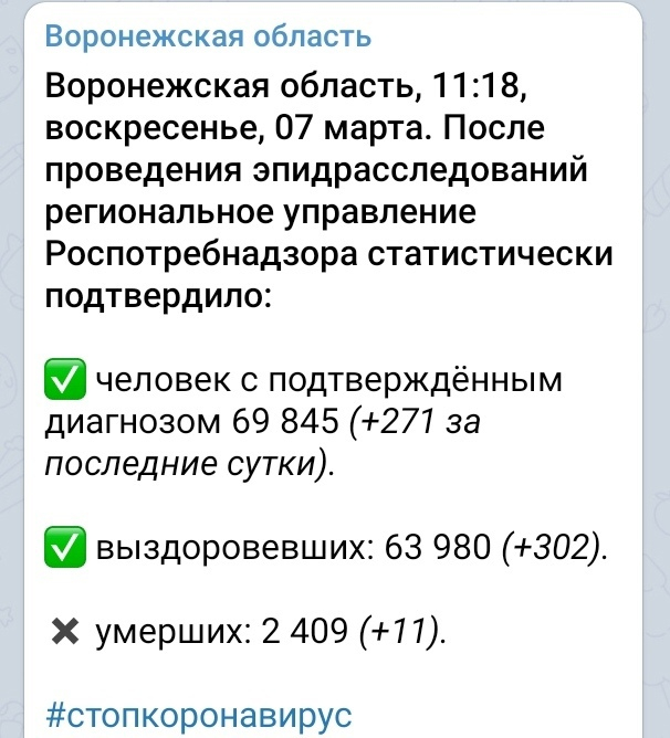 Для справки. За весь период пандемии ковидом в регионе заболели 69845 воронежцев, поправились — 63980 человек.