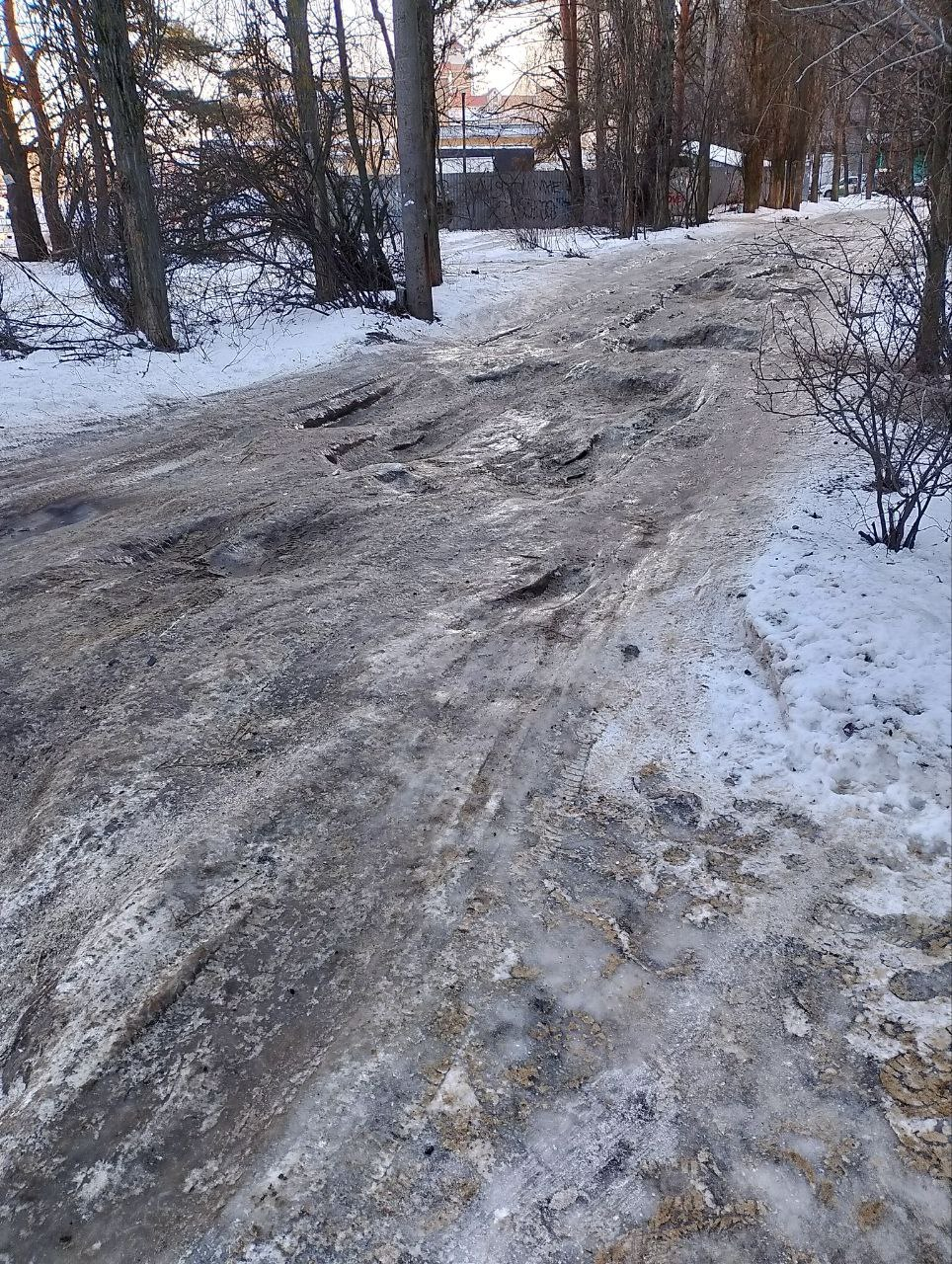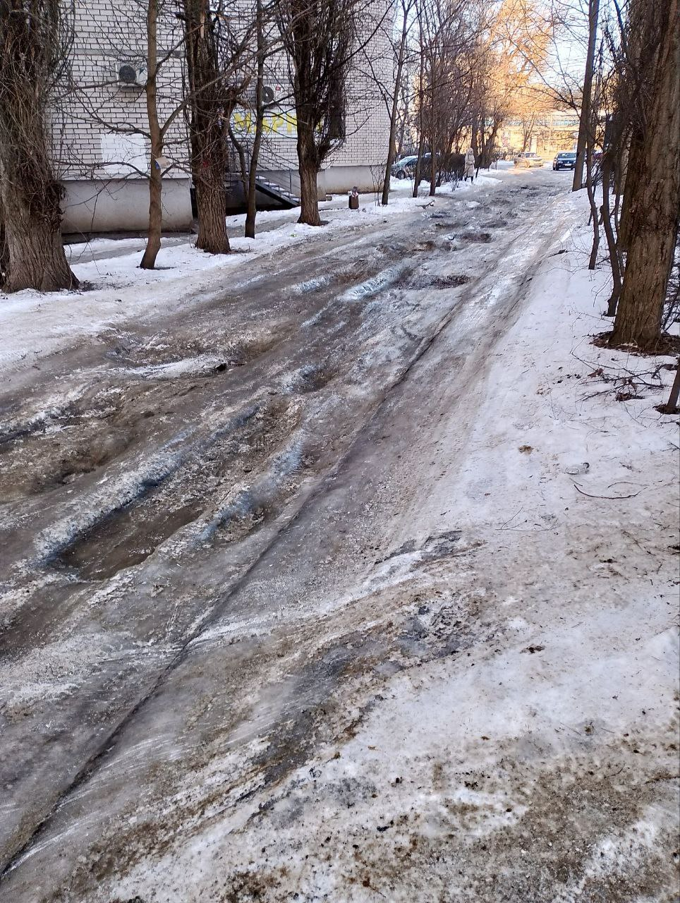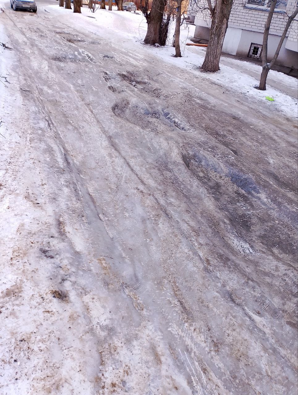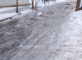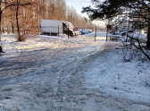 Судя по всему, коммунальные службы не проводили здесь ни качественную уборку снега, ни обработку противогололедными материалами, что при установившихся сильных морозах создает прямую угрозу для безопасности.