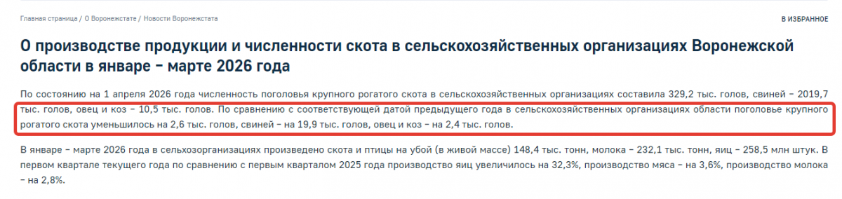 Ранее Воронежстат сообщал, что по итогам 2025 года (по сравнению с 2024) в регионе на 20 тысяч голов (!) или почти на 5 процентов сократился крупный рогатый скот.