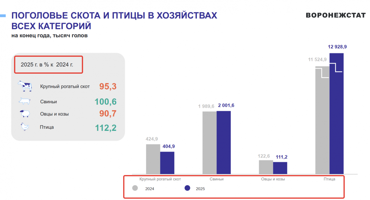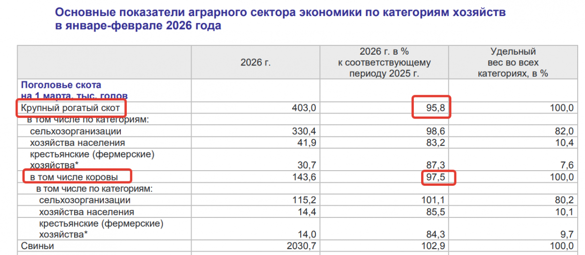 Что касается положения в животноводстве у других категорий производителей, то там положение не лучше. По последним данным Воронежстата, за январь – февраль 2026 года, в крестьянских (фермерских) поголовье КРС составляло 30,7 тысяч голов, оно уменьшилось почти на 13 процентов по сравнению с январем-февралем прошлого года, то есть, почти на 3000 голов. В категории «хозяйства населения» на начало года было 41,9 тысяч голов КРС, за год количество КРС сократилось почти на 16,8 процентов.