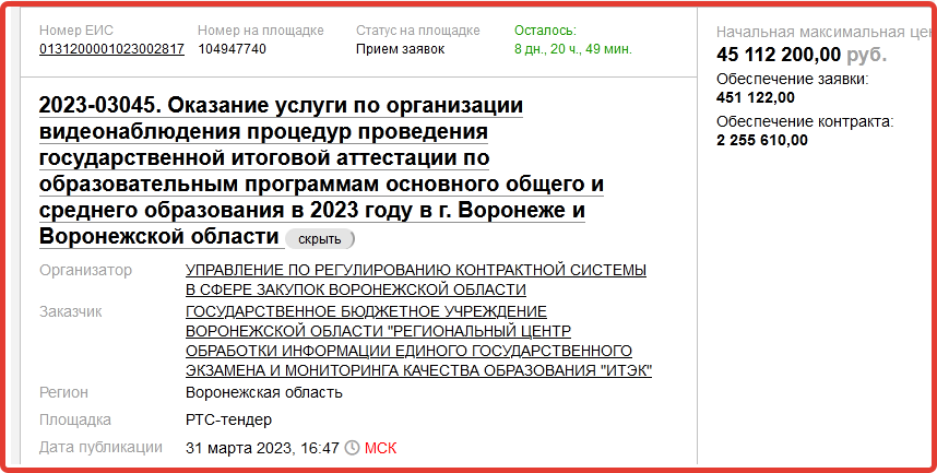 За эти деньги будет осуществляться контроль сдачи ЕГЭ (и других экзаменов) в воронежских школах и хранение видеозаписей. Информация о поиске исполнителя данных услуг была опубликована на сайте госзакупок в последний мартовский день.