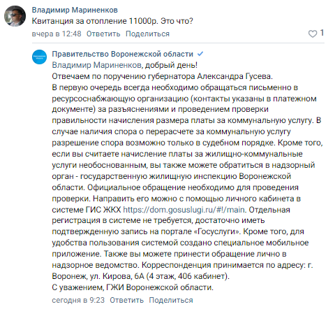Вот, например, в профиле губернатора Воронежской области Александра Гусева спрашивают: «Квитанция за отопление 11000р. Это что?»