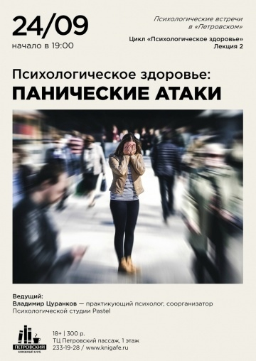 Психологическое здоровье: панические атаки в книжном клубе «Петровский». Очередная лекция в рамках просветительского проекта посвящена необъяснимым и мучительным для человека приступам тяжелой тревоги, которая сопровождается беспричинным страхом. Ведущий – практикующий психолог Владимир Цуранков.