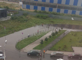 Стихийно образовавшаяся речушка не напугала горожан, а, наоборот, стала неожиданной находкой для желающих "освежиться". Особенно рады такому "подарку природы" дети — они резвятся в луже с удовольствием.