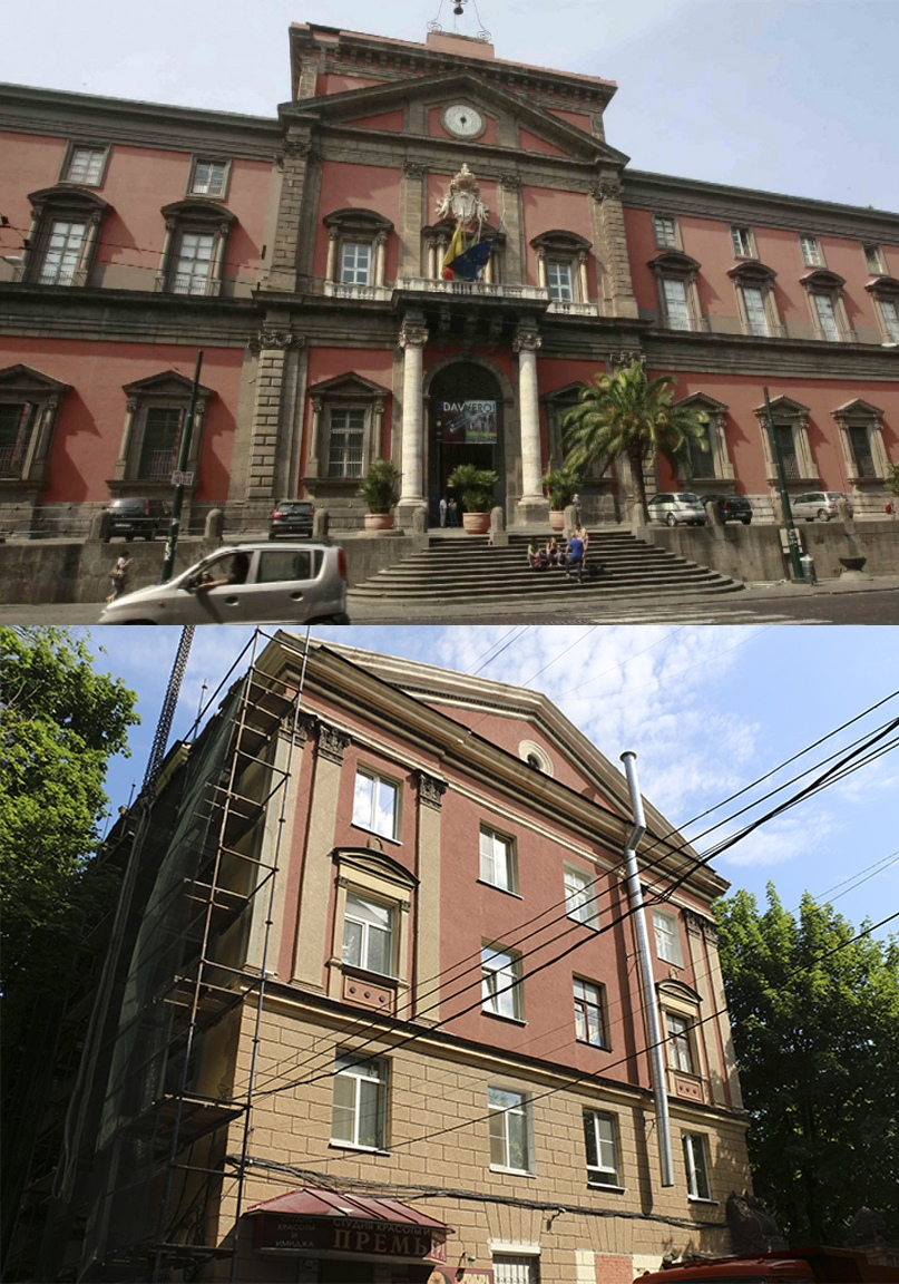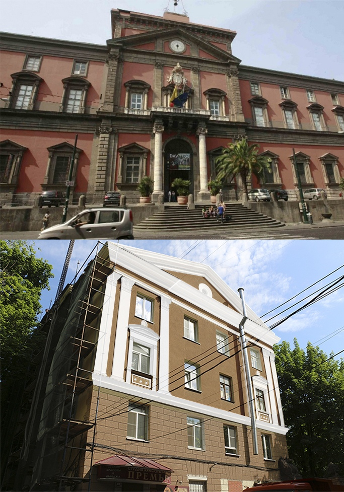 Пусть у нашего здания нет такого богатого фасада, но тем не менее сходство поражает: колонны, сандрики (декор над окнами), маленькие колонны по бокам окон, треугольная крыша и светлый круг в центре этого треугольника, и конечно цвета – все почти идентично. Более того, я думаю, что архитекторы еще старой советской школы специально перекрасили здания именно так, чтобы оно было отражением главного неаполитанского музея-дворца. Не знаю, как для вас, но я с глубоким уважением и почтением отношусь к такому решению предыдущего поколения архитекторов, которые создали столь прекрасный город, не говоря уже о том, что мне приятно видеть кусок неаполитанского дворца у себя в городе.