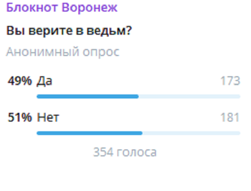 Из 354 человек, поучаствовавших в опросе, 173 заявили о том, что в ведьм верят. А это, на секундочку, 49% респондентов!