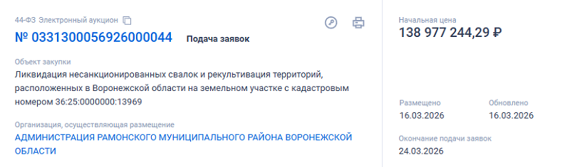 В системе Госзакупок появился тендер на ликвидацию несанкционированных свалок, расположенных по кадастровому номеру 36:25:0000000:13969. Торги на понижение с подрядчиками начинаются со 139,9 млн рублей.