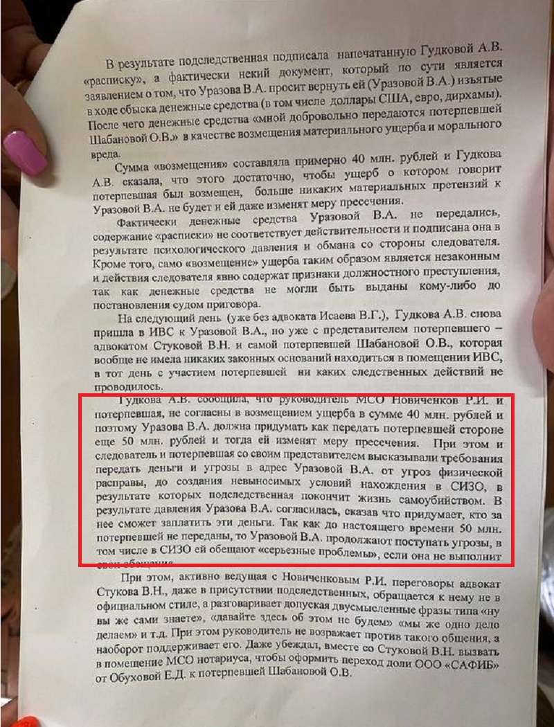 Всего же были изъяты 38 млн рублей. После «общения» руководителя Семилукского межрайонного СО СУ СК РФ по Воронежской области Новиченкова и его заместителя Гудковой находящаяся на тот момент в изоляторе временного содержания Валентина Уразова написала расписку о передаче 38 млн рублей Оксане Шабановой. А затем следователь Гудкова во внепроцессуальном порядке передала десятки миллионов потерпевшей Шабановой.