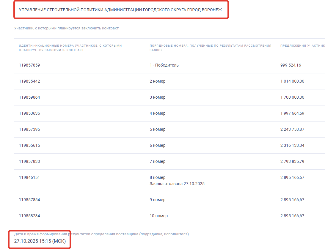 В результате торгов, состоявшихся в конце октября, победителем был признан ИП Шкурдов Юрий Сергеевич - предприниматель из Краснодарского края. Другие 9 участников торгов предложили более высокие цены на поставку и установку туалетного модуля, они предлагали от 1 млн рублей до почти 2,9 млн рублей.