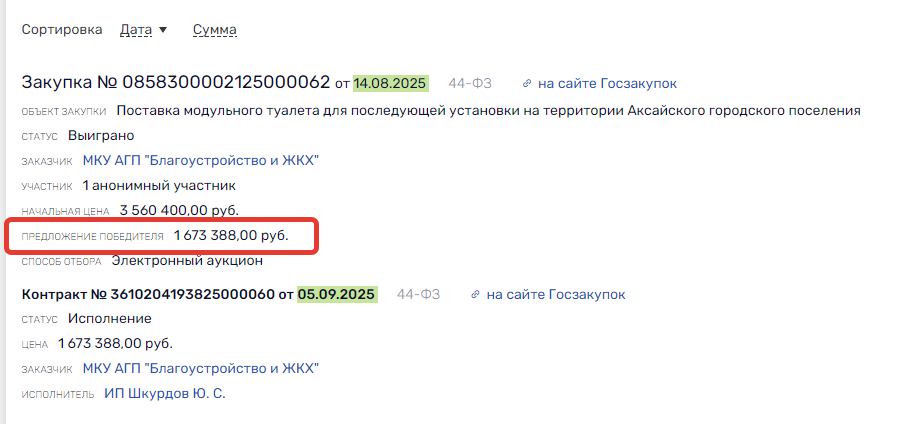 Победитель этих торгов, ИП Шкурдов Юрий Сергеевич, в сентябре подписал контракт на поставку модульного туалета за 1,6 млн рублей на территории Аксайского городского поселения Ростовской области.