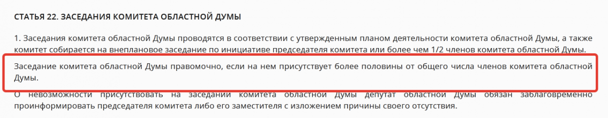 В том то и дело, что кворум якобы был соблюден (не без труда) в формате проведения заседаний сразу двух комитетов: из 15 депутатов присутствовали 7 (семь) человек и столько же - отсутствовали. А если бы комитет по бюджету проводил заседание «одиночно», то кворума на нем не было.