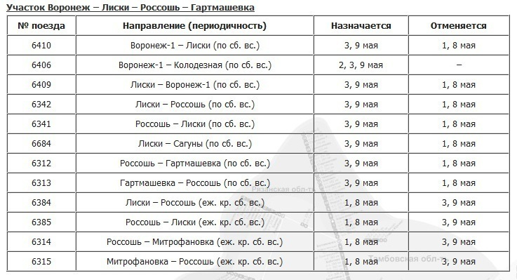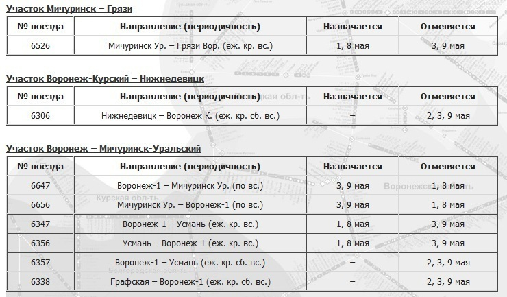 Расписание электричек изменится на 4 участках железной дороги: Воронеж - Лиски - Россошь - Гартмашевка, Мичуринск - Грязи, «Воронеж-Курский» - Нижнедевицк и Воронеж - Мичуринск-Уральский. Изменения будут действовать с 1 по 9 мая.