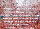 Напомним, памятник задумали в разбитные 90-е: хотели установить к 300-летию встречи, но реализовали идею год спустя – в 1997 году. Текст для памятника писали не историки, а какие-то политтехнологи-русофобы. «В период 26-28 августа 1696 года на Майдане Петр I, возвращаясь из второго Азовского похода, встретился с гетманом Украины Иваном Мазепой, обменялся с ним дорогими дарами, благодарил казаков за храбрость и верную службу».