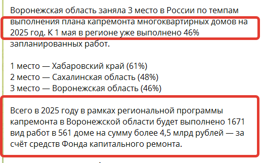 В четверг на его площадке появилась информация, что «всего в 2025 году в рамках региональной программы капремонта в Воронежской области будет выполнено 1671 вид работ в 561 доме на сумму более 4,5 млрд рублей — за счёт средств Фонда капитального ремонта».