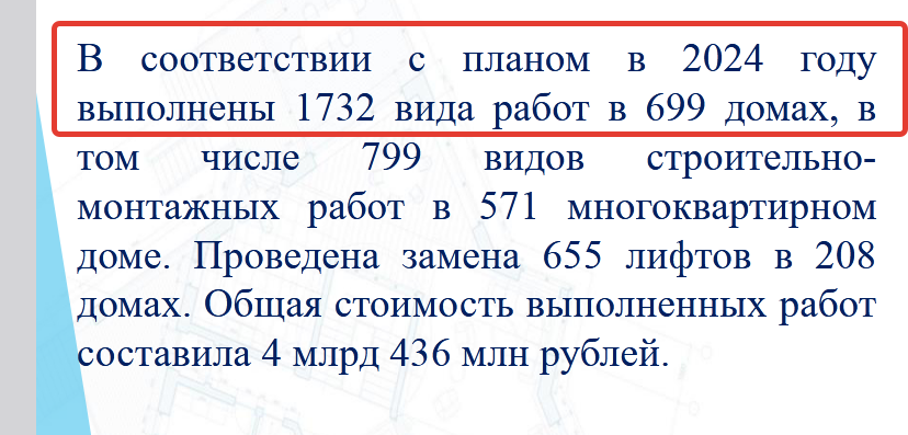 Несколькими месяцами ранее руководство Фонда капитального ремонта Воронежской области отчиталось о своей работе в 2024 году. Основные результаты были таковы: выполнены 1732 вида работ в 699 домах. Исходя из этих опубликованных цифр, как раз и получается: количество МКД, где будет в 2025 году проведен капремонт, сокращается на 138 зданий, а виды работ - на 61 единицу.