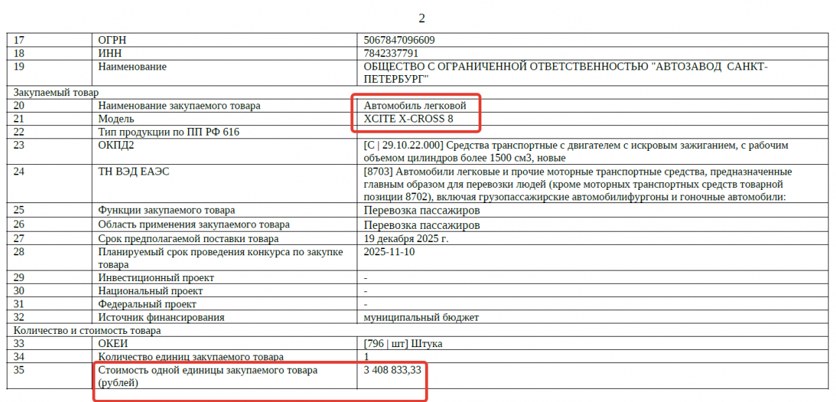 В этой статье сообщалось, что приобретаемый легковой автомобиль это – кроссовер, он имеет 5 дверей и может вместить 7 человек. XCITE X-Cross 8 Techno собирается из китайских машинокомплектов на питерском заводе Nissan и, как пишут автоэксперты, по сути дела является аналогом более известной Chery Tiggo 8.