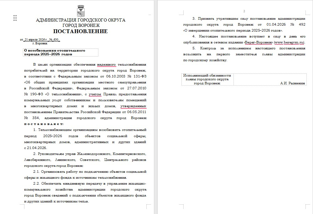 В последние дни воронежцы обрушились в социальных сетях на главу областного центра Сергея Петрина, требуя включить отопление. При этом в конце марта горожане не менее активно настаивали на необходимости закончить отопительный сезон. В итоге, и тогда мэр был вынужден пойти на встречу «чаяниям трудящихся», и теперь. Правда, он ушел в отпуск: постановление от 21 апреля 2026 г. № 630 «О возобновлении отопительного периода 2025–2026 годов» подписал первый замглавы по городскому хозяйству Алексей Рыженин: он исполняет обязанности мэра.