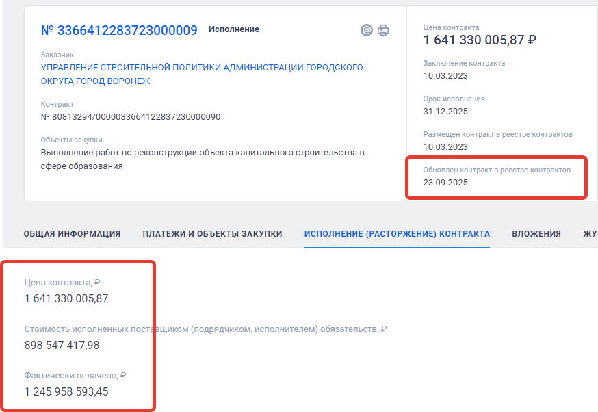 При том, что эта организация получила от заказчика за 2023 – 2024 года 744 млн рублей. Фактически за три последних года мэрия оплатила этой организации, как следует из данных карточки исполнения контракта, 1 млрд 245 млн рублей, а работы были приняты на 898 млн.