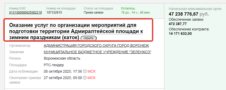 скриншот сайта госзакупок, прошлогодние торги на подготовку Адмиралтейской площади стоили казне 58 млн рублей, а в результате выбора подрядчика стоимость контракта была снижена всего на 1 тысячу рублей.