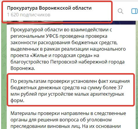 Тогда прокуратура Воронежской области сообщила, что «по результатам проверки установлен факт хищения бюджетных средств на сумму более 37 млн рублей при устройстве малых архитектурных форм». После чего главу управления строительной политики Евгения Шишкина и директора МКУ «Дирекция единого заказчика капитального строительства» Александра Кима отправили в СИЗО.