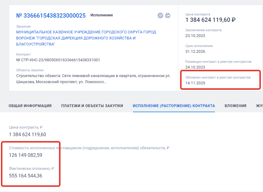 скриншот карточки исполнения контракта с АО "ПМК-38"по ливневой канализации