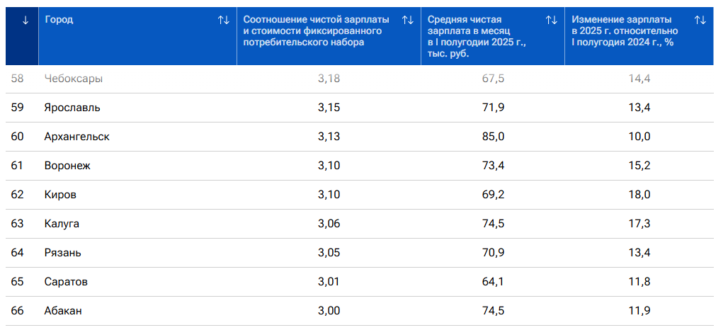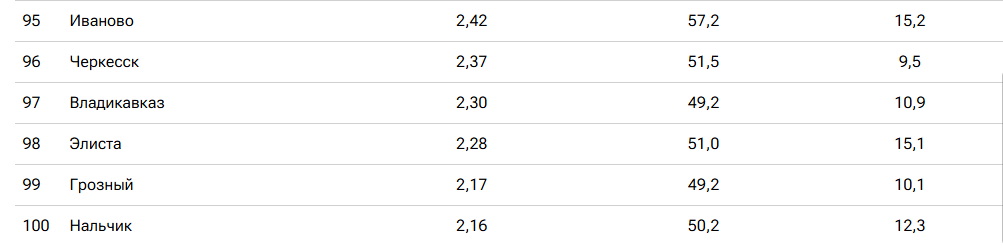 Аутсайдерами являются Элиста (заработная плата 51 тыс руб), Грозный (49,2 тыс) и Нальчик (50,2 тыс руб).