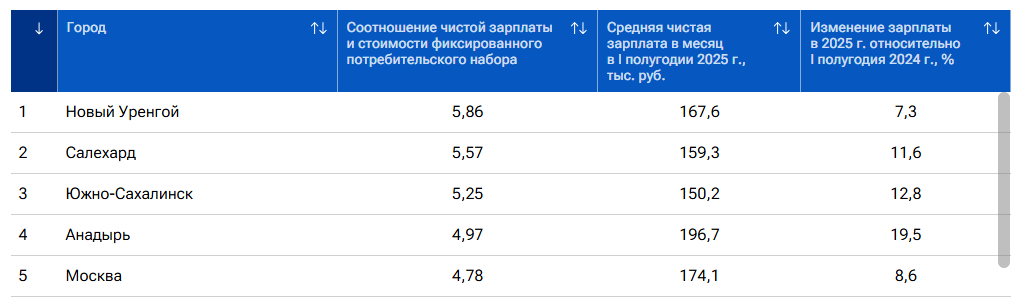 Возглавляет рейтинг Новый Уренгой (зарплата 167,6 тыс руб), Салехард (159,3 тыс руб) и Южно-Сахалинск (150,2 тыс руб).