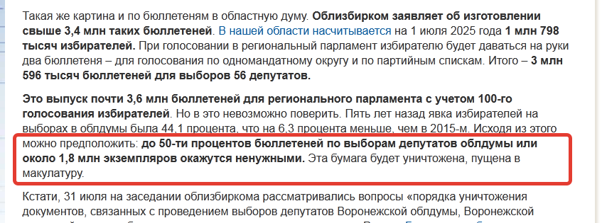 Прогноз «Блокнота», сделанный в начале августа, был примерно таким же, а именно, что «до 50-ти процентов бюллетеней по выборам депутатов облдумы или около 1,8 млн экземпляров окажутся ненужными. Эта бумага будет уничтожена, пущена в макулатуру».