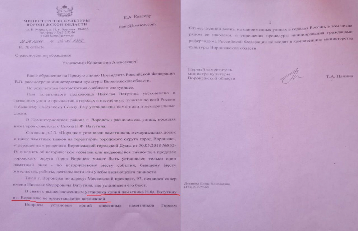 Квасов заявил, что такой ответ является приговором мировоззрению чиновников. Он также подчеркнул, что отказ произошел в год 80-летия Победы в Великой Отечественной войне. Николай Ватутин не только родился в Воронежской губернии, но еще и командовал Воронежским фронтом, освобождал Украину от нацистов.