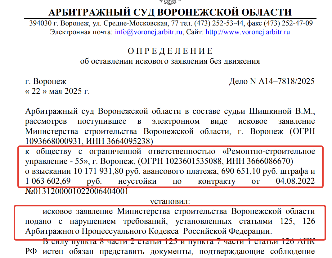 Министерство строительства Воронежской области начало судебные разбирательства с местным ООО «РСУ-55». С этой строительной организации, которую возглавляет Алексей Гамов, чиновники хотят «выбить» почти 12 млн рублей. Исковое заявление от провинциального минстроя было зарегистрировано в Арбитражном суде Воронежской области 19 мая. Однако чиновники не смогли юридически грамотно составить этот документ и, как записано в определении Арбитражного суда, «исковое заявление остается без движения».