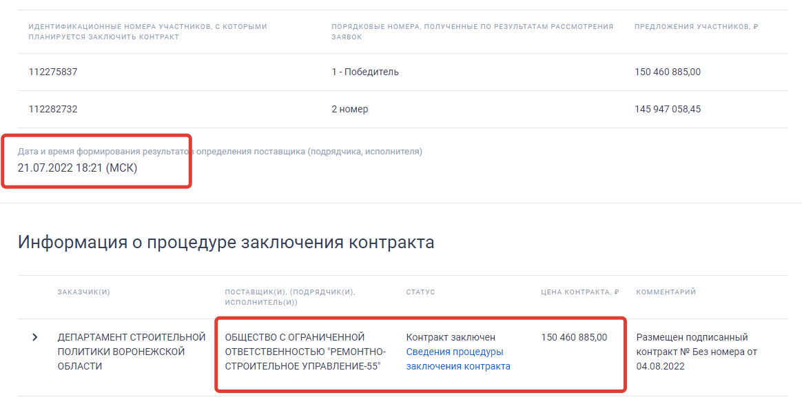 В торгах на сумму 150,4 млн рублей, которые проводились в конце лета 2022 года, приняли участие две организации. Одна из них предложила выполнить работы за 145,9 млн рублей, а ООО «РСУ-55» ни на копейку не стало снижать стоимость своих услуг, и было объявлено победителем. Никакой экономии бюджетных средств не было, более того, казна понесла существенные потери от этого «победителя».