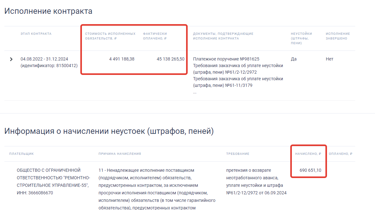 скриншот из карточки исполнения контракта, подрядчик, ООО "РСУ-55", с сентября 2022 г. по ноябрь 2024 г. не смог по назначению использовать выделенные ему более 30 млн р.